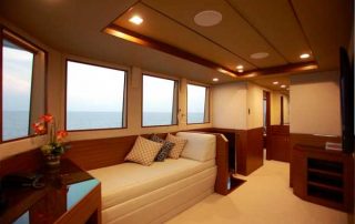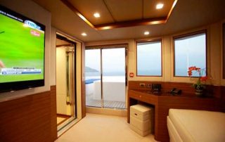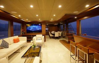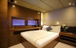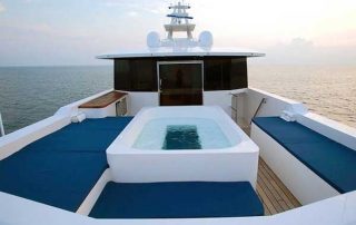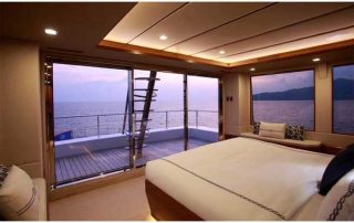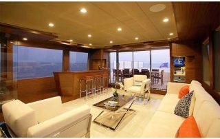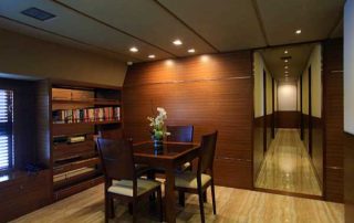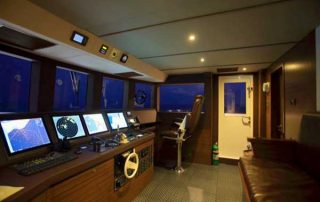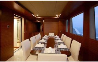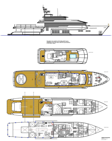 With a 10,000 nautical mile cruising range at 10 knots, she offers her new owner an exquisite and private 45 square meter penthouse suite with Jacuzzi (forward) and private terrace (aft), a massive 45 square meter saloon, bar, formal dining and kitchenette area, a 30 square meter alfresco dining deck, a 70 square meter helideck and outdoor entertainment platform, gymnasium, cinema with comprehensive library, and four en-suite guest accommodations.