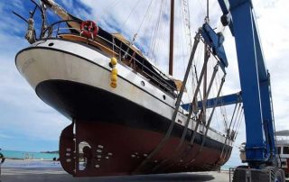 Cleaning and painting of hull, replacement of zinc anodes, removing, cleaning and refitting sea valves. Inspection of propeller, shaft, anchor chains and all connections, measurement of hull thickness.